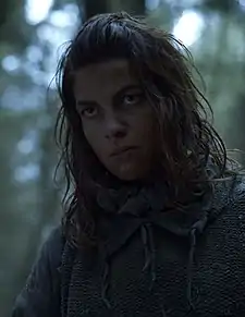 Osha travels with the Stark boys, their direwolves, and Hodor as they head for the Wall. They are crossed by the Reed siblings, Jojen and Meera, who try to reason with Bran. Jojen reveals who they are, and that Bran has a mission to reach the Three-Eyed Raven Beyond the Wall. Over time, Osha grows wary of Jojen and his ideas, and tries to confront him about putting ideas into Bran's head. Jojen reveals that they have no plan of going to the Wall, but instead inisit on traveling Beyond the Wall to seek the Three-Eyed Raven. Outraged, Osha warns them of the dangers and threats that lie ahead, which provokes her to tell them about her husband, Bruni, revealing that he had gone missing and came back days later as a White Walker and almost killed Osha.[21] She burnt down her hut with Bruni inside and fled south of the Wall before the dangers became prominent.[22] With her motivations clear, Osha tells Bran she will not go further than the Wall and will not break her promise to Luwin.[23] During a storm, the group take refuge inside an abandoned windmill, while a group of wildlings outside fight. Jojen reveals to Bran that he is a warg after accidentally warging Hodor, which leads him to warging himself into Summer and unknowingly saves Jon Snow and Ygritte. Osha is still frustrated over the entire situation, but Bran suggests that she take Rickon to Last Hearth to seek refuge with House Umber, loyal allies to House Stark. Agreeing, Osha and Rickon say their goodbyes, and part ways.[24]