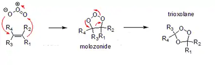 Molozonides are formed by the addition reaction between ozone and alkenes. They are rarely isolated during the course of the ozonolysis reaction sequence. Molozonides are unstable and rapidly convert to the trioxolane ring structure with a five-membered C–O–O–C–O ring.[8][9] They usually appear in the form of foul-smelling oily liquids, and rapidly decompose in the presence of water to carbonyl compounds: aldehydes, ketones, peroxides.