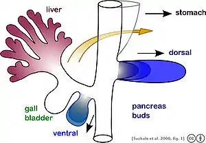 The definitive pancreas results from rotation of the ventral bud and the fusion of the two buds.[11] During development, the duodenum rotates to the right, and the ventral bud rotates with it, moving to a position that becomes more dorsal. Upon reaching its final destination, the ventral pancreatic bud is below the larger dorsal bud, and eventually fuses with it. At this point of fusion, the main ducts of the ventral and dorsal pancreatic buds fuse, forming the main pancreatic duct. Usually, the duct of the dorsal bud regresses, leaving the main pancreatic duct.[11]