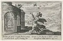 Daedalus was so envious of his nephew's accomplishments that he took an opportunity, when they were together one day on the top of a high tower, to push him off, but Athena, who favors ingenuity, saw him falling and arrested his fate by changing him into a bird called after his name, the perdix (partridge). This bird does not build its nest in the trees, nor take lofty flights, but nestles in the hedges, and mindful of his fall, avoids high places. For this crime, Daedalus was tried and banished.[3] In some accounts, Athena leaves Daedalus with a scar in the shape of a partridge, to remind him of what he did.