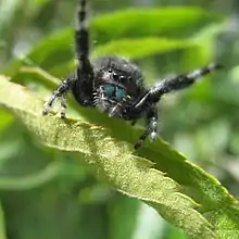 Like all jumping spiders, bold jumpers have exceptional eyesight.[1] Their unique visual system is widely regarded as the best amongst all spiders and plays an important role in courtship, hunting, and observational learning.[1][12][13] Bold jumpers have four pairs of eyes arranged in a semi-circle around their head, allowing them to see nearly 360° around them.[13] The forward-facing eyes are the largest and are known as the principal eyes or the anterior median (AM) eyes.[1] The retina of these eyes are able to rotate, allowing them to follow a moving target.[1][14] These eyes have the greatest resolution and are able to see color.[1][14] The remaining three pairs of eyes are known as the secondary eyes.[1] The first pair of secondary eyes are the anterior lateral (AL) eyes.[1] They are responsible for detecting approaching or "looming" objects.[14] Next is the posterior median (PM) eyes and the posterior lateral (PL) eyes.[1] These eyes help detect motion from the sides and behind.[1]