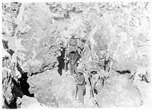 Chinese phosphate workers on Nauru standing between limestone pinnacles
