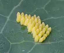 The pre-oviposition period, which lasts three to eight days, provides ample time for these butterflies to mate.[18] Females tend to use their forelegs to drum on the surfaces of their intended leaves as a test of the plant's suitability for breeding. If they find a suitable surface, female large whites oviposit two to three days following copulation. They oviposit approximately six to seven times in eight days. The females can pair up to mate again approximately five or more days after the previous mating.[17]
