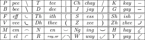 The consonants in Pitman's shorthand are pronounced pee, bee, tee, dee, chay, jay, kay, gay, eff, vee, ith, thee, ess, zee, ish, zhee, em, el, en, ray ar, ing, way, yay, and hay. When both an unvoiced consonant and its corresponding voiced consonant are present in this system, the distinction is made by drawing the stroke for the voiced consonant thicker than the one for the unvoiced consonant. (Thus s is ⟨)⟩ and z is ⟨)⟩.) There are two strokes for r: ar and ray. The former assumes the form of the top right-hand quarter of a circle (drawn top-down), whereas the latter is like chay ⟨/⟩, only less steep (drawn bottom to top). There are rules governing when to use each of these forms.