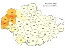 The majority of Poles in Ukraine assimilated into the Ukrainian culture. By 1959, 69% spoke the Ukrainian language, 19 percent spoke Polish and 12 percent spoke Russian.[11]