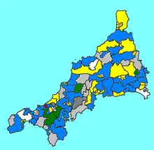 Elections for the new unitary Cornwall Council were held on 4 June 2009, and 123 members were elected, replacing the previous 82 councillors of Cornwall County Council and also another 249 (some of whom were also county councillors) on the six district councils.[7] At the 2009 elections, the Liberal Democrats lost overall control of Cornwall, with no single party gaining overall control of the new council. Although the Conservatives now have the largest number of elected members, they do not have a majority.[8] The Conservatives received 34% of the vote and won 50 seats, followed by the Liberal Democrats on 28% winning 38 seats, the Independents 23% and 32 seats, and Mebyon Kernow 4% and three seats. The turnout was 41%. Labour, the Green Party, UKIP and the BNP failed to secure any seats in Cornwall.[9][10]