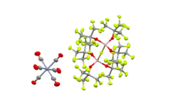 Synthesis of the chromium(I) homoleptic radical cation, [Cr(CO)6]•+, is achieved by use of PFAA's [Al(Opftb)4]− and [F{Al(Opftb)3}2]− as stabilizing anions.[9] Oxidation of Cr(CO)6 by NO+[PFAA]−'s under cold vacuum for short reaction times yields the kinetic product [Cr(CO)6]•+[PFAA]− as a pale yellow crystalline solid. Oxidation in a closed room temperature vessel for long reaction times yields the thermodynamic product [Cr(CO)5(NO)]+[PFAA]− as an orange crystalline solid. Assignment of the thermodynamic and kinetic products was further supported by ab initio calculations. Fluctional Jahn-Teller distortions at room temperature are indicated by the presence of a broad band in the Raman spectra of these compounds.[9]