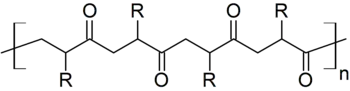 Polyketones are a family of high-performance thermoplastic polymers. The polar ketone groups in the polymer backbone of these materials gives rise to a strong attraction between polymer chains, which increases the material's melting point (255 °C for copolymer (carbon monoxide ethylene), 220 °C for terpolymer (carbon monoxide, ethylene, propylene). Trade names include Poketone, Carilon, Karilon, Akrotek, and Schulaketon. Such materials also tend to resist solvents and have good mechanical properties. Unlike many other engineering plastics, aliphatic polyketones such as Shell Chemicals' Carilon are relatively easy to synthesize and can be derived from inexpensive monomers. Carilon is made with a palladium(II) catalyst from ethylene and carbon monoxide. A small fraction of the ethylene is generally replaced with propylene to reduce the melting point somewhat. Shell Chemical commercially launched Carilon thermoplastic polymer in the U.S. in 1996,[1] but discontinued it in 2000.[2] Hyosung announced that they would launch production in 2015.[3]