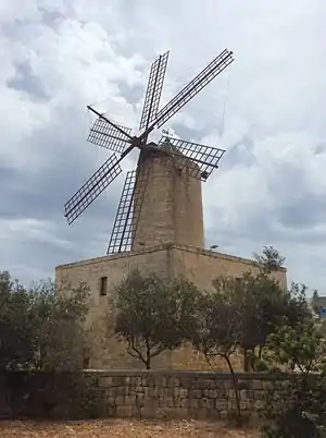 A windmill is a structure that converts wind power into rotational energy using vanes called sails or blades, by tradition specifically to mill grain (gristmills), but in some parts of the English-speaking world the term has also been extended to encompass windpumps, wind turbines, and other applications. The term wind engine is also sometimes used to describe such devices. (Full article...)