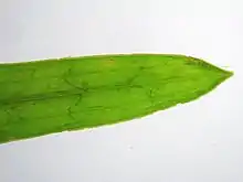 Grass-wrack pondweed is relatively easily distinguished from most other pondweeds by its combination of strongly flattened stems and sclerenchymatous strands in the leaf . P. acutifolius is similar in Europe but can be distinguished by its sharply pointed leaves, less branched habit and flower spikes with only 2-6 flowers on peduncles up to 20 mm long.[4] In the Far East, P. mandschuriensis is an altogether smaller plant, with leaves 1.5-2.3 mm wide and 8-14 sclerenchymatous strands, stem 0.8-1.5 mm wide, and fruit 2.8-3.8 mm diameter.[5]
