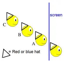 Three players are told that each of them will receive either a red hat or a blue hat. They are to raise their hands if they see a red hat on another player as they stand in a circle facing each other. The first to guess the colour of his or her hat correctly wins.
