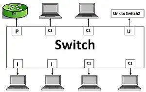 • Promiscuous port (P-Port): The switch port connects to a router, firewall or other common gateway device. This port can communicate with anything else connected to the primary or any secondary VLAN. In other words, it is a type of a port that is allowed to send and receive frames from any other port on the VLAN.