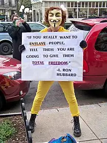 Protesters at the demonstration wore masks, and said they were attempting to inform the public about what they believed to be "restrictions of free speech and profiteering through pyramid schemes" by the Church of Scientology.[54] They asserted they were not protesting the doctrine of Scientology, but rather alleged actions of individual Scientologists.[54] One protester stated that he had created a Facebook group to organize the protest, explaining "It started online with a group called Anonymous ... They got upset with Scientology because the church hides important documents that are supposed to be released to the public."[54]