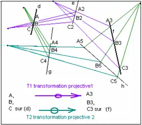 A spacial perspectivity of a projective configuration in one plane yields such a configuration in another, and this applies to the configuration of the complete quadrangle. Thus harmonic quadruples are preserved by perspectivity. If one perspectivity follows another the configurations follow along. The composition of two perspectivities is no longer a perspectivity, but a projectivity.