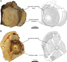 Ptychodus was a large shark, previously estimated at 10 meters (33 feet) long based on extrapolation from tooth.[12][13] The subadult specimen with the largest vertebra showed that it could reach lengths of 4.3–7.07 m (14.1–23.2 ft), so a 10 m (33 ft) length is possible, but more analysis is required for verification.[6] Unlike the colossal nektonic planktivores Rhincodon (whale sharks) and Cetorhinus (basking sharks) which relied upon gill rakers to acquire their food, the Ptychodus had a massive arrangement of crushing plate teeth. A Ptychodus jaw contains many teeth, up to 550 teeth, 220 of which are on the lower jaw and 260 in the upper jaw. These teeth were very large as well—Paleontologists believe that the largest tooth plate measured 55 centimeters in length and 45 centimeters in width. There are two distinct formations of tooth plates between the genus; one being juxtaposed, non-overlapping tooth rows, and another being imbricated tooth rows.[14] It is believed that the shape coincides with the diet of the species and their geographic locations, but the time it lived has a big part as well. Ptychodus marginalis teeth differ from Ptychodus polygyrus. P marginalis was in the Middle Cenomanian to Middle Turonian deposits in the English Chalk, while P. polygyrus was in the Late Santonian-Early Campanian deposits.[15]