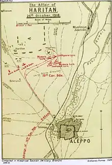The Pursuit to Haritan occurred between 29 September and 26 October 1918 when the XXI Corps and Desert Mounted Corps of the Egyptian Expeditionary Force (EEF) pursued the retreating remnants of the Yildirim Army Group advanced north from Damascus after that city was captured on 1 October during the final weeks of the Sinai and Palestine Campaign of the First World War. The infantry and corps cavalry advanced from Haifa and Acre to capture the Mediterranean ports at Beirut and Tripoli between 29 September and 9 October. These captures enabled the inland pursuit to be supplied when the Desert Mounted Corps' 5th Cavalry Division resumed the pursuit on 5 October. The cavalry division occupied one after the other, Rayak, Homs, Hama. Meanwhile, Prince Feisal's Sherifial Force which advanced on the cavalry division's right flank, attacked and captured Aleppo during the night of 25/26 October after an unsuccessful daytime attack. The next day the 15th (Imperial Service) Cavalry Brigade charged a retreating column and attacked a rearguard during the Charge at Haritan near Haritan which was at first reinforced but subsequently withdrew further north.