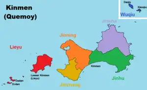 The county consists of the major island of Kinmen along with several surrounding islets, as well as Wuqiu Township remotely located 133 km (83 mi) northeast from the rest of the county.[4] Kinmen is one of two counties that constitutes Fujian Province, the other being Lienchiang County (Matsu).