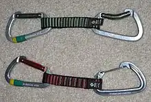 A quickdraw consists of two carabiners connected by a semi-rigid material (sometimes called the "dogbone").[1] One carabiner has a straight gate and connects to an anchoring device. The other carabiner is for the climbing rope, and uses a bent gate.[2] Quickdraws are manufactured with either a solid carabiner gate or a wire carabiner gate for its lighter weight.