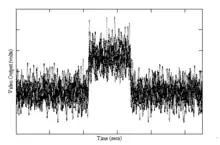 Tangential sensitivity, (TSS), defines that input power which results in a video signal to noise ratio of approximately 8 dB from the detector.[24]:16 The thumbnail shows an example of a typical detected pulse at the TSS limit, with the pulse + noise sitting at a level just clear of the noise floor. The TSS level is too low a value for reliable pulse detection in a practical scenario, but it can be determined with sufficient accuracy in bench tests on a receiver to give a quick guide figure for system performance.
