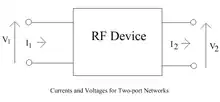 Each two-port network in an RF chain can be described by a parameter set, which relates the voltages and currents appearing at the terminals of that network.[4]:29 Examples are: impedance parameters, i.e. z-parameters; admittance parameters, i.e. y-parameters or, for high frequency situations, scattering parameters, i.e. S-parameters.[5][6]:663 Scattering parameters avoid the need for ports to be open or short-circuited, which are difficult requirements to achieve at microwave frequencies.