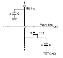 Dynamic random-access memory (DRAM) allowed replacement of a 4 or 6-transistor latch circuit by a single transistor for each memory bit, greatly increasing memory density at the cost of volatility. Data was stored in the tiny capacitance of each transistor, and had to be periodically refreshed every few milliseconds before the charge could leak away. Toshiba's Toscal BC-1411 electronic calculator, which was introduced in 1965,[16][17][18] used a form of capacitive bipolar DRAM, storing 180-bit data on discrete memory cells, consisting of germanium bipolar transistors and capacitors.[17][18] While it offered higher speeds than magnetic-core memory, bipolar DRAM could not compete with the lower price of the then dominant magnetic-core memory.[19]