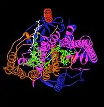 - Deisenhofer J, Epp O, Miki K, Huber R, Michel H (December 1984). "X-ray structure analysis of a membrane protein complex. Electron density map at 3 A resolution and a model of the chromophores of the photosynthetic reaction center from Rhodopseudomonas viridis". Journal of Molecular Biology. 180 (2): 385–98. doi:10.1016/S0022-2836(84)80011-X. PMID 6392571.