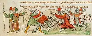The Laurentian Codex provides the following information.[1][2] In 1022, Prince Mstislav the Brave, who at the time was the prince of Tmutarakan, started a military operation against the Alans. During the operation, he encountered the Kassogian army commanded by Rededya. To avoid unnecessary bloodshed, Mstislav and Rededya, who possessed an extraordinary physical strength, decided to have a personal fight, with the condition that the winner would be considered the winner of the battle. The fight lasted some hours and, eventually, Rededya was knocked to the ground and stabbed with a knife.[3] The subjects of Rededya were forced to admit defeat. Mstislav ascribed his win to the Virgin, whom he prayed to before the battle.