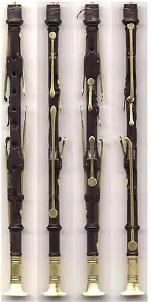 • from the back, the thumbhole (for high g) and two keys operated by the right thumb (for low F sharp and for d sharp),