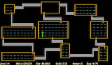 As Toy was more proficient at programming, he led the development of the game in the C language, which generally produced fast, effective code. Wichman learned the language from Toy as they went along while providing significant input on the design of game.[3][4] The first two major aspects of the game developed were the method of displaying the dungeon on-screen to the player, and how to generate the dungeon in a random manner. Limited by choices of what a terminal could display, they stuck to ASCII characters, such as . for empty floor space, + for doors, and | and - for walls of the dungeon. They also used the "at" symbol (@) to represent the player, considering this showed the player "where they're at".[3] For the dungeon, they found initial attempts at purely random generation to be weak, in some cases having a stairway ending up in a room inaccessible to players. They found a solution through procedural generation, where each level would start on the idea of a 3x3 tic-tac-toe grid, with each room of various size occupying one space in this grid, and then creating the hallways to connect the rooms.[3] Once they could have their character move about these randomly created dungeons, they added equipment, magic items, and monsters. With magic items, they wanted the effects of these items to be a mystery on each run-through, and thus would initially present the items to the player only by a descriptor such as color, and only later in the game give the true name of the item once the player experimented or used another means to identify the item.[3] For monsters, they wanted to have more advanced intelligence routines as the player got deeper in the dungeons, but had started running into memory limits on the VAX-11, and simply made the monsters stronger with more health to pose more of a challenge.[3][1]