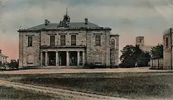 Roscommon Courthouse is located on Abbey Street. It was built in 1832 adjacent to the new gaol (now the site of Roscommon garda station) to replace the previous courthouse, which is now known as Harrison Hall and which currently houses a branch of the Bank of Ireland.[13][14] The courthouse was severely damaged by fire in 1882 and was restored later in the 1880s.[14] The courthouse is the venue for sittings of Roscommon District and Circuit Courts. The floor of the entrance hall features a mosaic of the Roscommon crest and over the main staircase hangs a large portrait of Douglas Hyde, the first president of Ireland.