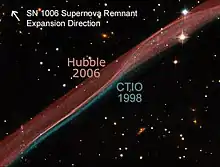 SN 1006's associated supernova remnant from this event was not identified until 1965, when Doug Milne and Frank Gardner used the Parkes radio telescope to demonstrate a connection to known radio source PKS 1459−41.[11] This is located near the star Beta Lupi, displaying a 30 arcmin circular shell.[12] X-ray and optical emission from this remnant have also been detected, and during 2010 the H.E.S.S. gamma-ray observatory announced the detection of very-high-energy gamma-ray emission from the remnant.[13] No associated neutron star or black hole has been found, which is the situation expected for the remnant of a Type Ia supernova (a class of explosion believed to completely disrupt its progenitor star).[14] A survey in 2012 to find any surviving companions of the SN 1006 progenitor found no subgiant or giant companion stars,[15] indicating that SN 1006 most likely had double degenerate progenitors; that is, the merging of two white dwarf stars.[15]