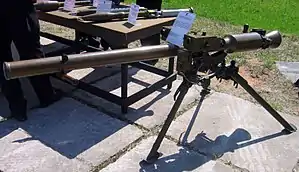 The SPG-9 Kopyo (Russian: СПГ-9 Копьё, transliterated Russian: Stankovyi Protivotankovyi Granatomet "Kopyo" - Heavy Antitank Grenade Launcher "Spear") is a tripod-mounted man-portable, 73 millimetre calibre recoilless gun developed by the Soviet Union. It fires fin-stabilised, rocket-assisted high explosive (HE) and high-explosive anti-tank (HEAT) shaped charge projectiles similar to those fired by the 73 mm 2A28 Grom low pressure gun of the BMP-1 armored vehicle. It was accepted into service in 1962, replacing the B-10 recoilless rifle.