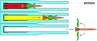 Sabots use driving bands and obturators, because the same manufacturing tolerance issues exist when sealing the saboted projectile in the barrel, but the sabot itself is a more substantial structural component of the in-bore projectile configuration.[1] Refer to the two armor-piercing fin-stabilized discarding sabot (APFSDS) pictures on the right to see the substantial material nature of a sabot to fill the bore diameter around the sub-caliber arrow-type flight projectile, compared to the very small gap sealed by a driving band or obturator to mitigate what is known classically as windage. More detailed cutaways of the internal structural complexity of advanced APFSDS saboted long rod penetrator projectiles can be found in #External links.