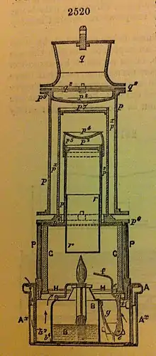 Improper use of safety lamps defeated the purpose of the safety lamp and caused risk. When the flame went out in a lamp there was a temptation for the collier to open and relight it. Some opened the lamps to light tobacco pipes underground.[20] Both of these practices were strictly forbidden. The miner was expected to return to the shaft, a round trip of up to a few miles, to relight an extinguished lamp. For men on piece work paid for what they produced, a relighting could cost them perhaps 10% of their day's pay, encouraging them to take the risk. To prevent dangerous relighting (or opening the lamp to light a pipe), from the mid-century onwards, and particularly after the 1872 act, lamps had to have a lock mechanism which prevented the miner opening the lamp. Two schemes existed: either a special tool was required which was kept at the pit head, or else opening the lamp extinguished the flame. The latter mechanism can be seen in the Mueseler, Landau, and Yates lamps below. Such a lamp was known as a protector lamp, a term picked up and used as a company name.[21] Only on the return to the bank could the lamp man open the lamp for refilling and service. Various different locking mechanisms were developed; miners tended to be ingenious in finding ways of circumventing them. A number of additional lit lamps were supposed to accompany each gang of men, but restricting the number was an obvious economy for the pit owners.