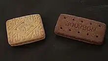 - Bourbon biscuit, big chocolate cookie which is filled with a lot of chocolate creme