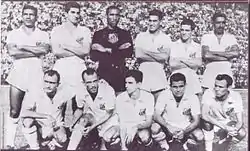 Between the 1917 and 1926 seasons, Santos was recognized as a solid and talented team, but one that could not offer a true challenge for the state title, finishing no higher than fourth place.[20] That changed in 1927 when the tradition of the Alvinegro became defined during the 1920s: the discovery and creation of young talent. The team, known as O ataque dos 100 gols (English: The 100-goal attackers), was led by the first major club idol, Araken Patusca, son of the first president of Santos. With the Araken Patusca was the first Santista to participate in a World Cup, as a member of the Brazilian national team in the FIFA World Cup in 1930, the first World Cup. He played one match against Yugoslavia.[21] Santos finished as runners-up in 1927, 1928 and 1929, scoring 100 goals in 16 games in the 1927 season, resulting in an incredible rate of 6.25 goals per match. The milestone of 100 goals was a result of work characteristics that later would become an excerpt in the official anthem of the club: Técnica e Disciplina (English: Technique and Discipline). Santos entered a period of irregular campaigns, coinciding with the club's transition to professionalism; in 1933 the president of Santos publicly declared Santos a professional side for the first time. This was followed by the club's first great success in 1935.[15] During that season, the club prepared heavily for the Paulistão with 14 friendlies, winning seven, losing four and drawing three matches. The 10-1 thrashing of Espanha at the hands of Santos provided the highlight of its preseason preparations. On the last match of the state competition, Santos defeated Corinthians 2–0 at the Estádio Parque São Jorge, Corinthians' home ground at the time, to win their first state title ever, thanks to goals by Raul and an experienced Araken Patusca. This historic consecration sealed Santos' first major title and paved the way for future generations to follow.[15]