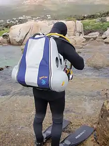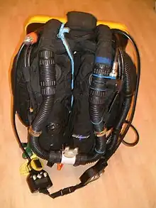 A backplate and wing is an alternative configuration of scuba harness with a buoyancy compensation bladder known as a "wing" mounted behind the diver, sandwiched between the backplate and the cylinder or cylinders. Unlike stabilizer jackets, the backplate and wing is a modular system, in that it consists of separable components. This arrangement became popular with cave divers making long or deep dives, who needed to carry several extra cylinders, as it clears the front and sides of the diver for other equipment to be attached in the region where it is easily accessible. This additional equipment is usually suspended from the harness or carried in pockets on the exposure suit.[12][62] Sidemount is a scuba diving equipment configuration which has basic scuba sets, each comprising a single cylinder with a dedicated regulator and pressure gauge, mounted alongside the diver, clipped to the harness below the shoulders and along the hips, instead of on the back of the diver. It originated as a configuration for advanced cave diving, as it facilitates penetration of tight sections of cave as, sets can be easily removed and remounted when necessary. The configuration allows easy access to cylinder valves, and provides easy and reliable gas redundancy. These benefits for operating in confined spaces were also recognized by divers who made wreck diving penetrations. Sidemount diving has grown in popularity within the technical diving community for general decompression diving,[63] and has become a popular specialty for recreational diving.[64][65][66]