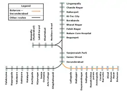 The Secunderabad–Bolarum (abbr. SB) is a suburban rail service of the Multi-Modal Transport System of Hyderabad, India.[1] Spanning 11 stations, it runs between Secunderabad and Bolarum 5 times a day.[2]