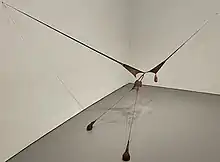In 1975, following the birth of her son and seeing the changes in her body, Nengudi began her R.S.V.P. series (also known as repondez s’il vous plait), for which she is best known.[15][4] Combining her interest in movement and sculpture, Nengudi created abstract sculptures of everyday objects through choreographed sets which were either performed in front of a live audience or captured on camera.[16] The sculptures were made from everyday objects, like pantyhose, and parts were stretched, twisted, knotted, and filled with sand.[16] The finished sculptures, originally intended to be able to be touched by the audience, were often hung on gallery walls but stretched across gallery space, evoking the forms of bodily organs, sagging breasts, and a mother's womb.[17][9][6] For her, the use of pantyhose as a material reflected the elasticity of the human body, especially the female body.[16][18] These sculptures as well as her later performance pieces involving pantyhose expressed a mélange of sensuality, race identity, body image, and societal impacts on women's bodies.[19]