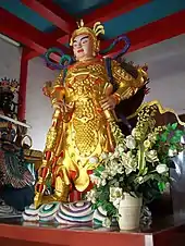 In Mahayana Buddhism, he is described as a manifestation of Mahābrahmārāja. He has five hair coils (頭五角髻), a handsome face (顏貌端正) and emanates purple-golden light (紫金色) that surpasses the light of the other devas. In Chinese Buddhism, Skanda (also sometimes known as Kumāra (鳩摩羅天)) is known as Weituo (韋陀 or 韋馱), a young heavenly general, the guardian deity of local monasteries and the protector of Buddhist dhamma.[60][61] According to Henrik Sørensen, this representation became common after the Tang period, and became well established in the late Song period.[62] He is also regarded as one of the twenty-four celestial guardian deities, who are a grouping of originally Hindu and Taoist deities adopted into Chinese Buddhism as dharmapalas.[63] Skanda was also adopted by Korean Buddhism, and he appears in its woodblock prints and paintings.[62]