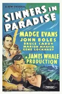 Sinners in Paradise is a 1938 American south seas adventure film directed by James Whale and starring Madge Evans, John Boles, Bruce Cabot, Marion Martin and Gene Lockhart. In 1966, the film entered the public domain in the United States because the claimants did not renew its copyright registration in the 28th year after publication.[2]