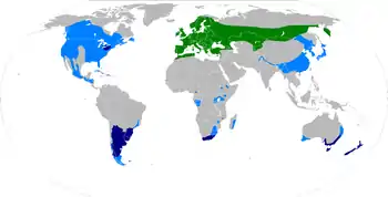 The species has reached other continents, such as Australia, South Africa and North America, through the export of timber and firewood. While invasion was prevented in North America for a long time, the sirex woodwasp established itself in New Zealand around 1900. There, it contributed to massive pine declines in the first half of the 20th century, spreading to Tasmania in the 1950s and then to the Australian mainland. Since 1980, it has reached pine plantations in Uruguay, and later also Argentina, Brazil and Chile; it was found in South Africa in 1994. The population increased in the Great Lakes area from 2004 on; the species had reached Vermont, New York, Pennsylvania, Ohio, and Michigan by 2009.[9][10] The wasps can swarm between 20 and 50 km (12 and 31 mi), and has been estimated to take until about 2050 to spread to the far southeast of the USA at the current spreading rate.[11][12]