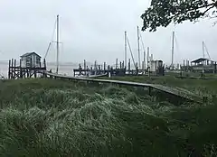Skippool, more specifically its creek, was a major trading port for hundreds of years, similar to that of Wardley's Creek on the other side of the river.[4] It is understood to have been in constant use from the end of the Middle Ages. Goods arrived at the docks from all over the world. Flax was brought in from Ireland and the Baltic; timber came from North America; and tallow arrived from Russia.[4] More locally, limestone and oats were transported from Ulverston and coal from Preston.[4] Its popularity fell out of favour when Fleetwood's port opened in the 1840s.[5]