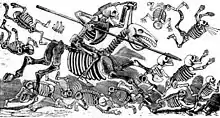 Indigenous Mexican art celebrates the skeleton and uses it as a regular motif. The use of skulls and skeletons in art originated before the Conquest: The Aztecs excelled in stone sculptures and created striking carvings of their Gods.[1] Coatlicue, the Goddess of earth and death, was portrayed with a necklace of human hearts, hands and a skull pendant. She was imbued with the drama and grandeur necessary to dazzle the subject people and to convey the image of an implacable state. The worship of death involved worship of life, while the skull – symbol of death – was a promise to resurrection. The Aztecs carved skulls in monoliths of lava, and made masks of obsidian and jade. Furthermore, the skull motif was used in decoration. They were molded on pots, traced on scrolls, woven into garments, and formalized into hieroglyphs. Hindu temples and depiction of some Hindu deities have displayed skull art.