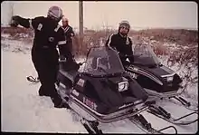 Snowmobile drivers wearing snowmobile suits in Minnesota.