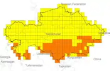 Kazakhstan's steppe geography makes it suitable for wind energy applications and the estimated potential of wind energy that can be economically developed is about 760GW.[22] About 50% of Kazakhstan's territory has average wind speeds suitable for energy generation (4–6 m/s) with the strongest potential in the Caspian Sea, central and northern regions. The most promising individual sites are in the Almaty region in the Dzungar (Dzungarian) Gates, 600 km northeast of Almaty close to the Xinjiang border and the Chylyk Corridor 100 km east of Almaty. Wind potentials of 525Wm2 in the Dzungar Gates and 240Wm2 in the Chylyk corridor have been estimated with power production from wind turbines potentially achieving 4400 kWh/MW and 3200 kWh/MW respectively.[23] Currently, the Ministry of Industry and New Technologies selected 10 sites to build large wind power plants (WPP) with total capacity of 1,000 MW with a view to commercial production of electricity in the amount of 2-3 billion kWh. Currently only one wind energy plant is operating in Kazakhstan; the Kordai wind power plant with 1500 kW capacity was launched in December 2011 in Zhambyl region.[24]