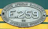 The traditional number plates on the sides of SAR locomotives were usually in a perfect oval shape and were usually cast in a leaded bronze. On the Class 5E, Series 1, however, the plates were in an oval shape with blunted ends and were cast in aluminium.[4]