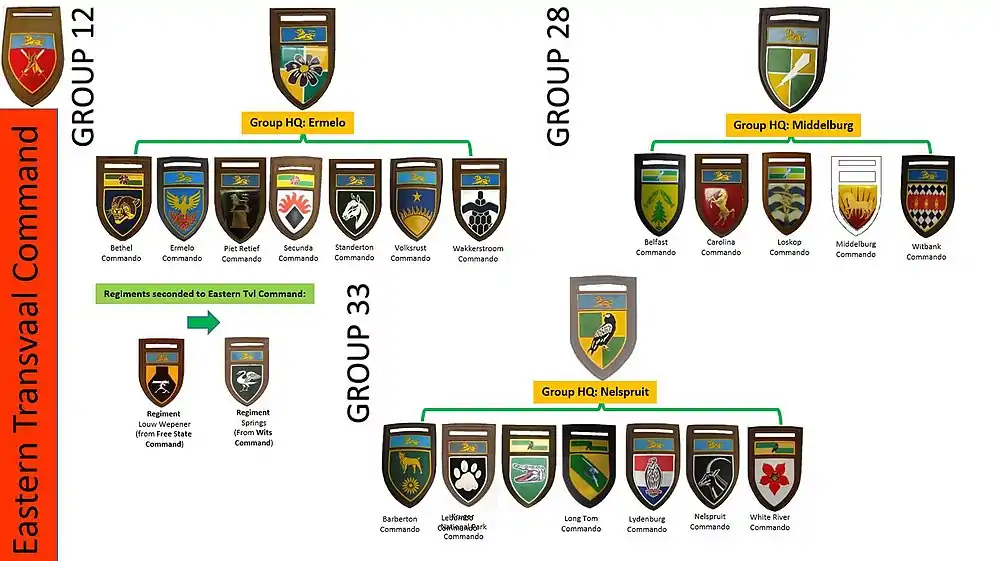 Under the SADF, Commando units were grouped regionally under Commands: (Please note: This was not a wholly static structure and units could move occasionally between Groups, the diagrams below depict the structure from the late 1980s)