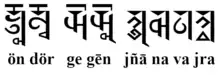 Soyombo contains the full set of letters to reproduce Sanskrit and Tibetan. Note that some of the letters represent different sounds in Mongolian, Sanskrit, and Tibetan. The primary difference between the three occurs in Mongolian where letters for Sanskrit voiceless sounds are used for voiced stops, while the letters for voiceless aspirated sounds are used for voiceless stops.[3] In Mongolian, letters used specifically for Tibetan and Sanskrit are called 'гали' galig noting they are characters used for the transcription of foreign sounds.[3]
