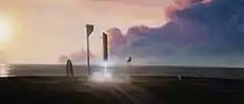 In September 2017, at the 68th annual meeting of the International Astronautical Congress, Musk announced a new launch vehicle calling it the BFR, again changing the name, though stating that the name was temporary.[76] The acronym was alternatively stated as standing for Big Falcon Rocket or Big Fucking Rocket, a tongue-in-cheek reference to the BFG from the Doom video game series.[53] Musk foresaw the first two cargo missions to Mars as early as 2022,[77] with the goal to "confirm water resources and identify hazards" while deploying "power, mining, and life support infrastructure" for future flights. This would be followed by four ships in 2024, two crewed BFR spaceships plus two cargo-only ships carrying equipment and supplies for a propellant plant.[76]